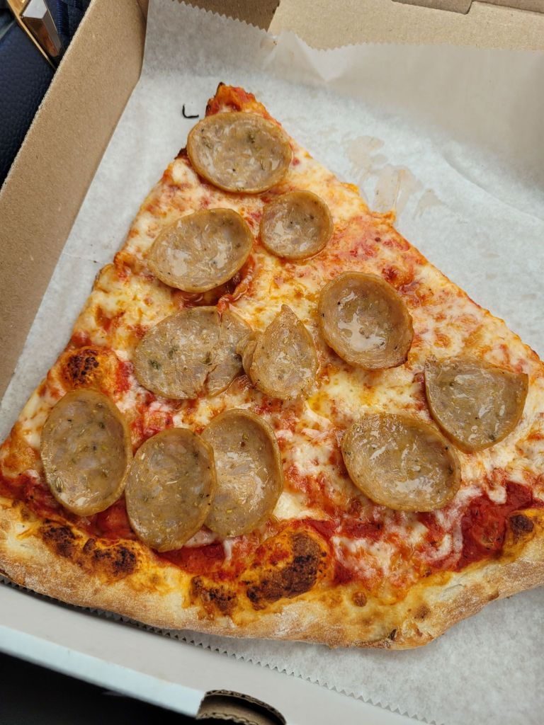 I’d heard about the big pizza slices — so of course I had to try one. I went with sausage, and while the sausage looked a little funny 😂 it actually wasn’t bad at all. I also grabbed BBQ wings to go with