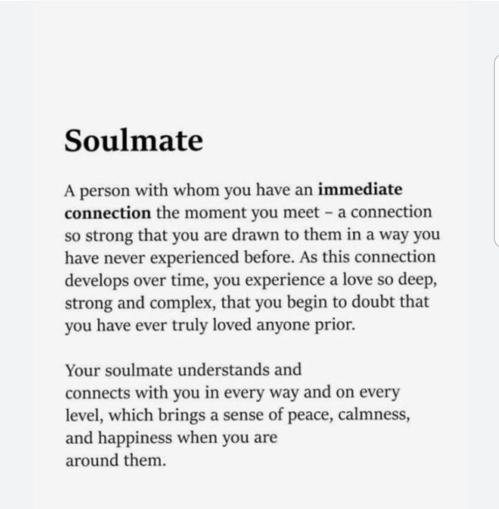 When I look up a definition of a Soulmate it says a person ideally suited to another as a close friend or romantic partner. I do believe in soulmates. I think that it is someone out there for everyone. It is a connection with a person. I am still waiting on my soulmate, and I believe he is out there. Here is a saying on soul mates: make sure to check it out.
